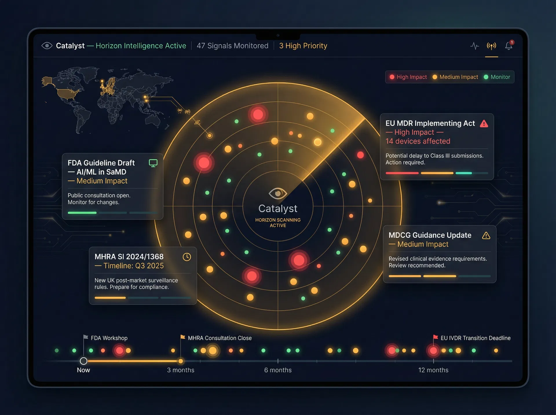 The strategic layer of RuleMedi. Catalyst is the anticipatory intelligence engine that scans for regulatory change, predicts its impact on your device portfolio, and provides the foresight needed to stay decisively ahead of the curve.