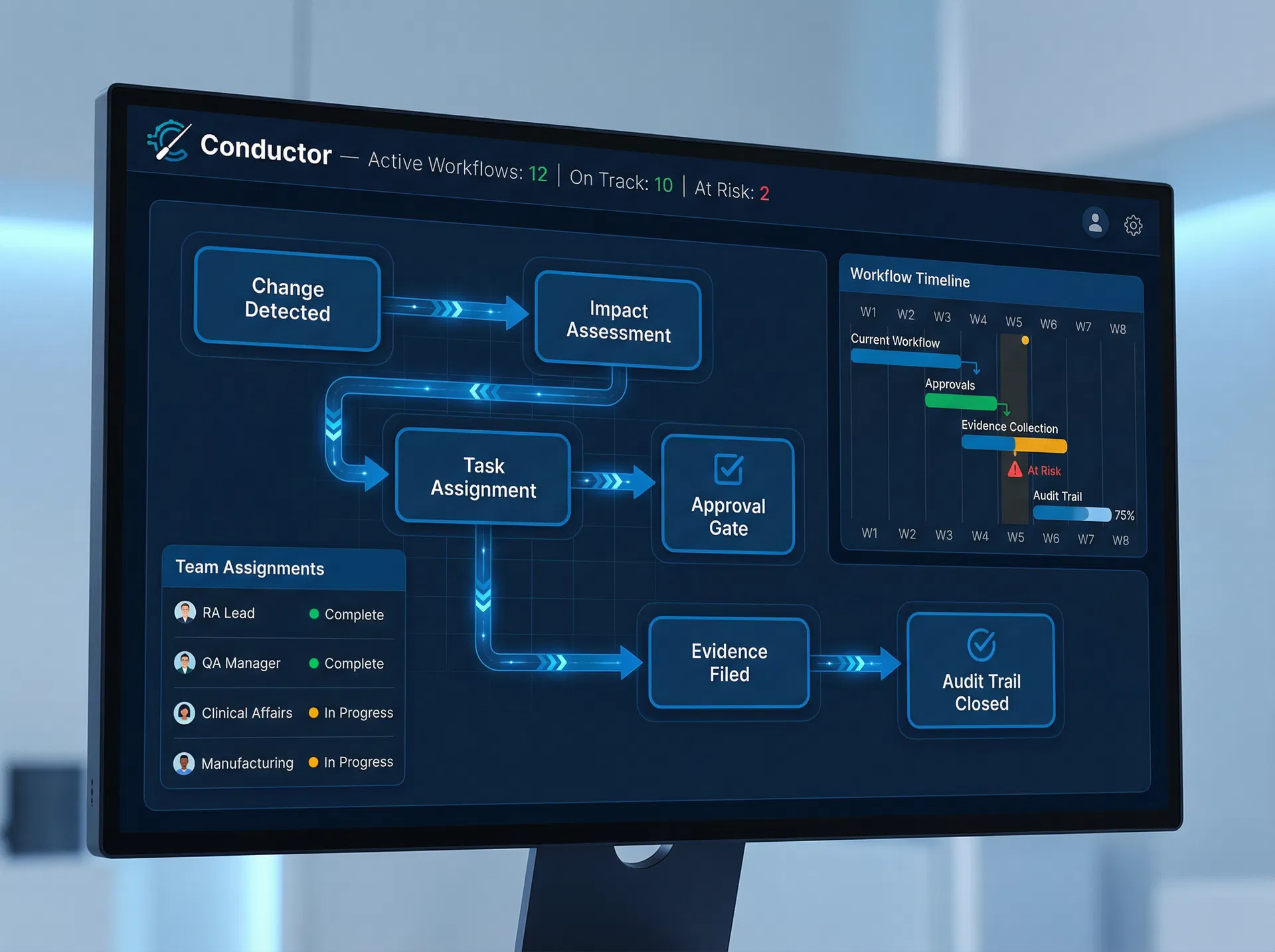 The operational engine of RuleMedi. Conductor orchestrates people, processes, and evidence across all functions — from RA/QA and Clinical to Manufacturing and Vigilance — ensuring that compliance tasks are executed with consistent governance and a complete, unbroken audit trail.